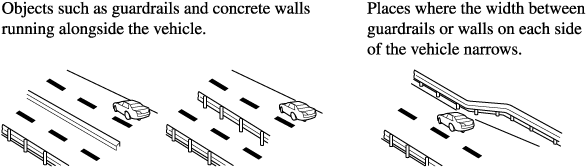 The BSM warning lights may turn on in reaction to stationary objects on the road or the roadside such as guardrails, tunnels, sidewalls, and parked vehicles.