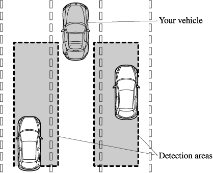 The detection area on this system covers the driving lanes on both sides of the vehicle and from the rear part of the doors to about 50 m (164 ft) behind the vehicle.