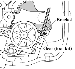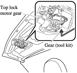 The top lock lever completely engages with the vehicle body (locked condition) at the position where the teeth of the gear (tool kit) contact the bracket.