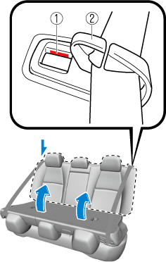 If the red indication is visible behind the push knob, it means the seatback is not locked. If the vehicle is driven without the seatback locked, it could fold down suddenly and cause an accident.