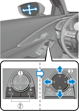 Press the select switch for the outside mirror to be tilted downward to turn on the indicator light of the select switch.
