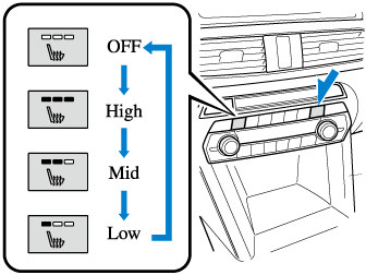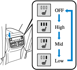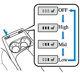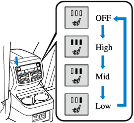 Press the seat warmer switch while the ignition is switched ON to operate the seat warmer. The indicator lights turn on to indicate that the seat warmer is operating. The mode changes as follows each time the seat warmer switch is pressed.