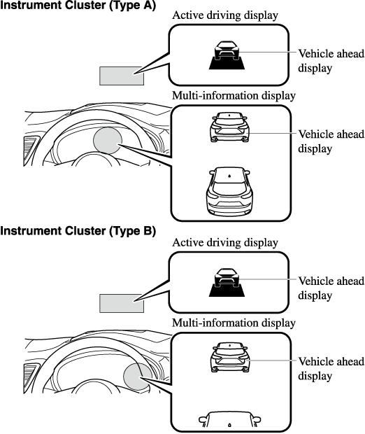 The DRSS operation status is indicated in the active driving display or multi-information display. Regarding malfunctions, check the vehicle conditions or have it inspected by an Authorized Mazda Dealer according to the content of the displayed message.