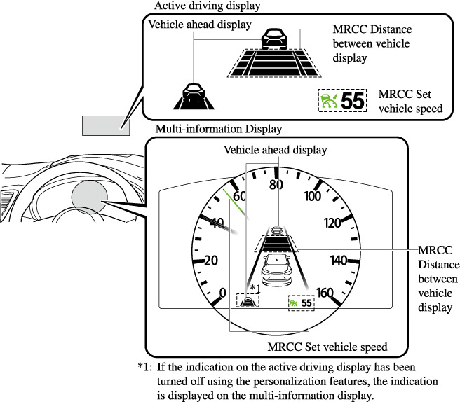 The MRCC with Stop & Go function setting status and operation conditions are indicated on the multi-information display and the active driving display.