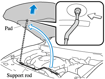 3. Grasp the support rod in the padded area and secure it in the support rod hole indicated by the arrow to hold the hood open.