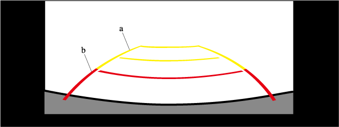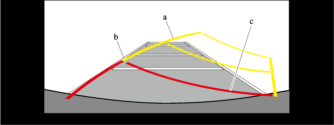 In the above illustration, the right side of the vehicle is in a position closer to the actual distance displayed by the distance guide lines (red: about 50 cm (19 in) point, yellow: about 100 cm (39.3 in) point behind the rear bumper), whereas the left side is in a position farther away.