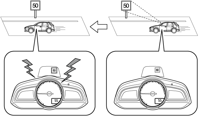 • If the Forward Sensing Camera (FSC) incorrectly recognizes the actual speed limit sign at a lower speed, the excessive speed alarm is activated even if the vehicle is driven at the legal speed.