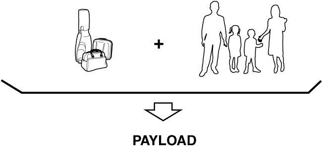 The cargo weight limit with two occupants is 385 kg (849 lbs) - (68 × 2) kg ( (150 × 2) lbs) = 249 kg (549 lbs)