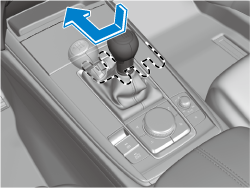 Your vehicle is equipped with a device to prevent shifting to R (reverse) by mistake. Push the shift lever downward and shift to R.