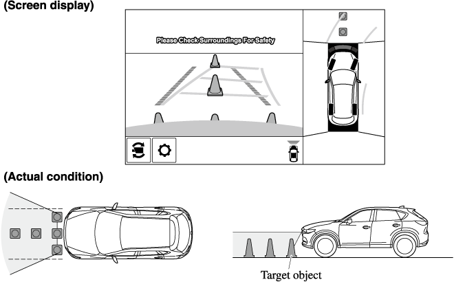 The parking sensor detection range has limitations. For example, obstructions closing in from the side and objects short in height may not be detected. Always confirm the safety around the vehicle visually when driving.