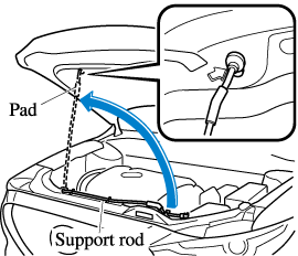 3. Grasp the support rod in the padded area and secure it in the support rod hole indicated by the arrow to hold the hood open.