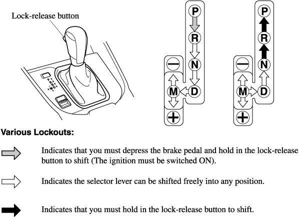 The Sport AT has an option that is not included in the traditional automatic transaxle that gives the driver the option of selecting each gear instead of leaving it to the transaxle to shift gears. Even if you intend to use the automatic transaxle functions as a traditional automatic, you should also be aware that you can inadvertently shift into manual shift mode and an inappropriate gear may be retained as the vehicle speed increases. If you notice the engine speed going higher or hear the engine racing, confirm you have not accidentally slipped into manual shift mode (Search).