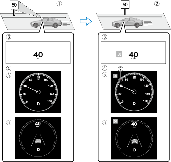 If the vehicle speed exceeds the speed limit sign indicated in the active driving display/instrument cluster while the vehicle is driven, the system notifies the driver using the indication in the active driving display/instrument cluster and a warning sound.