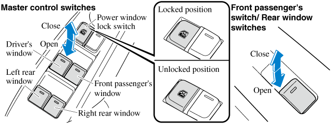 The front passenger's side and rear windows can be opened/closed when the power window lock switch on the driver's door is in the unlock position. Keep this switch in the locked position while children are in the vehicle.
