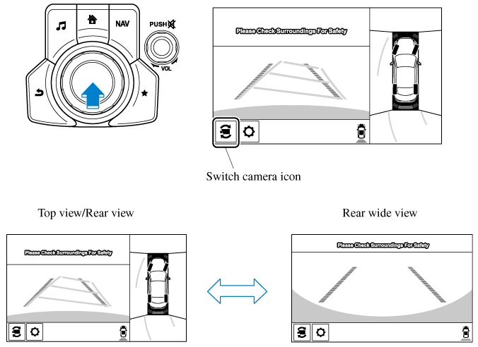 The displayed screen can be switched by pressing the commander knob or by touching the switch camera icon on the screen while the top view/rear view, rear wide view is displayed.