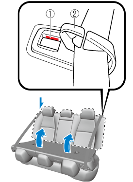 If the red indication is visible behind the push knob, it means the seatback is not locked. If the vehicle is driven without the seatback locked, it could fold down suddenly and cause an accident.