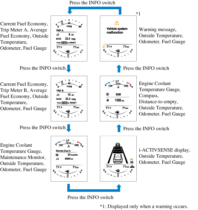 The screen content changes each time the INFO switch is pressed.