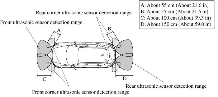 Rear ultrasonic sensor: Approx. 150―60 cm (59.0―23.6 in) |