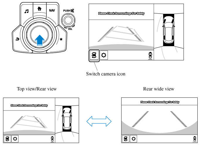 The displayed screen can be switched by pressing the commander knob or by touching the switch camera icon on the screen while the top view/rear view, rear wide view is displayed.