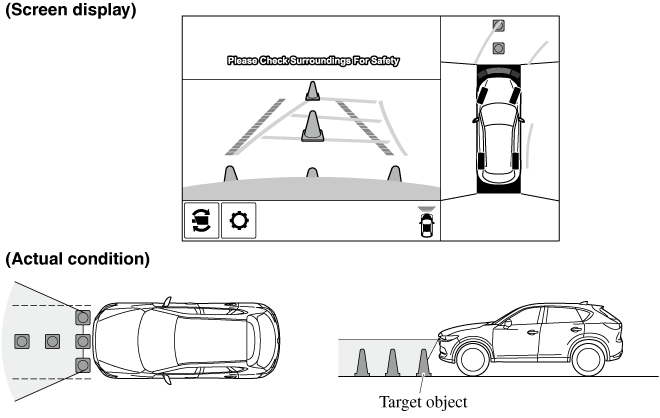 The parking sensor detection range has limitations. For example, obstructions closing in from the side and objects short in height may not be detected. Always confirm the safety around the vehicle visually when driving.