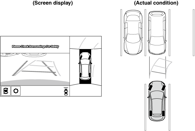 In the top view screen, the areas in black at the front and rear of the vehicle image and the seams where each of the camera images merge are blind spots.