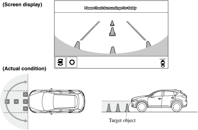 Indicates the approximate width of the vehicle and the distance (from front end of bumper) in front of the vehicle.