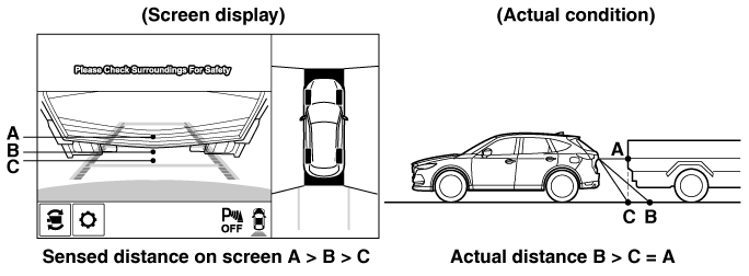 If the vehicle is on a slope, obstructions taken by the camera can appear farther or closer than the actual distance from the vehicle.