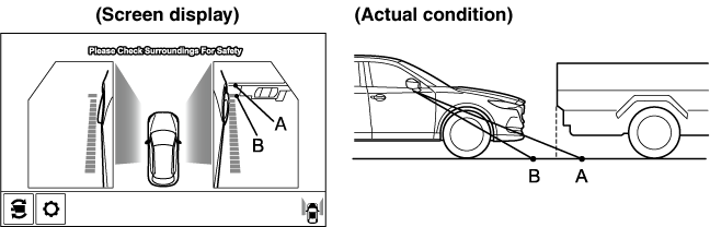 Because the vehicle front end guide lines (side camera) or the distance guide lines (rear camera) are displayed based on a flat surface, the distance to the three-dimensional object displayed on the screen is different from the actual distance.