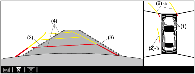 Indicates the approximate projected path of the vehicle. Moves in conjunction with the steering wheel operation. a) Indicates the path where the edge of the front bumper is expected to travel. b) Indicates the path where the inner side of the vehicle is expected to travel. |