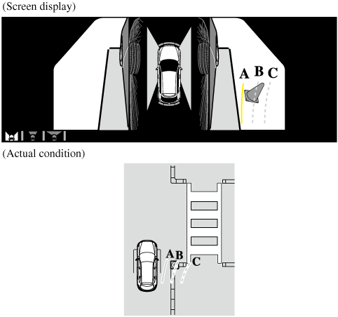If the projected vehicle path lines are on an obstruction (B) or outside of the obstruction (C), the vehicle may contact the obstruction when turning the vehicle sharply.