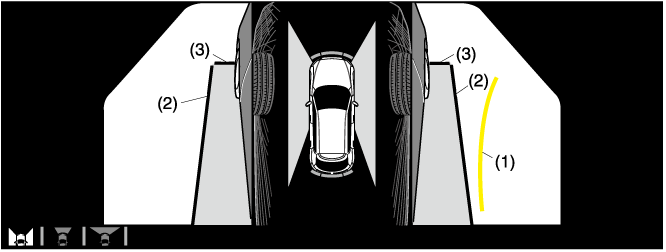 Indicates the approximate projected path of the vehicle. Moves in conjunction with the steering wheel operation. The projected vehicle path lines (yellow) indicate the path the inner side of the vehicle is expected to travel. |