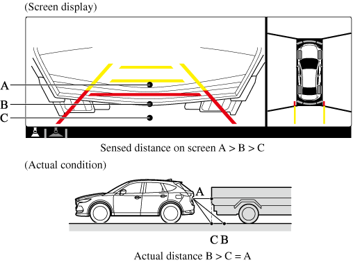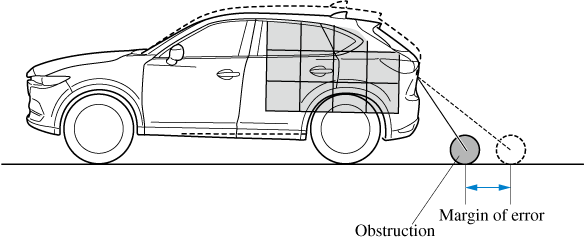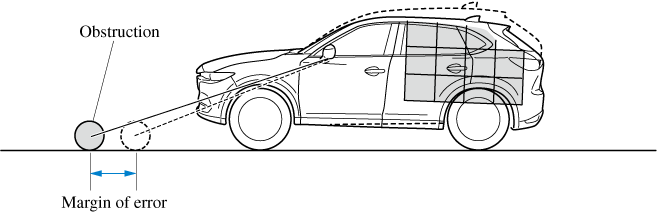 If there is a steep up or down grade in the road at the front or rear of the vehicle, obstructions picked up by the camera can appear farther or closer than the actual distance from the vehicle.