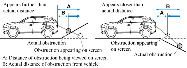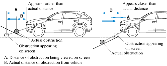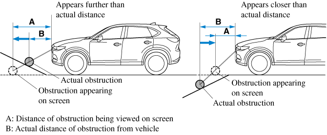 If the vehicle is on a slope, obstructions taken by the camera can appear farther or closer than the actual distance from the vehicle.