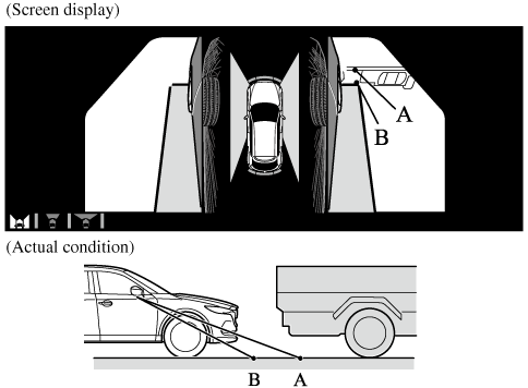 Because the vehicle front end guide lines (side camera) or the distance guide lines (rear camera) are displayed based on a flat surface, the distance to the three-dimensional object displayed on the screen is different from the actual distance.