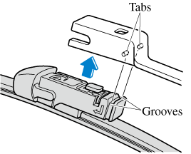 Slide the blade component in the direction of the arrow while pressing the wiper arm tab to remove the blade component from the wiper arm.