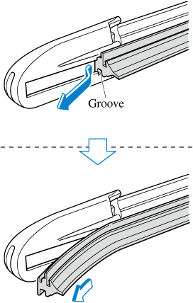 Do not bend the blade rubber unnecessarily when replacing it. Otherwise, the metal stiffener in the blade may deform and the windshield wiper operation may be adversely affected.