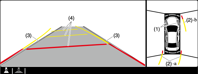 Indicates the approximate projected path of the vehicle. Moves in conjunction with the steering wheel operation. a) Indicates the path where the edge of the rear bumper is expected to travel. b) Indicates the path where the outer side of the vehicle is expected to travel. |