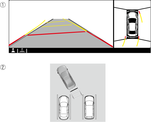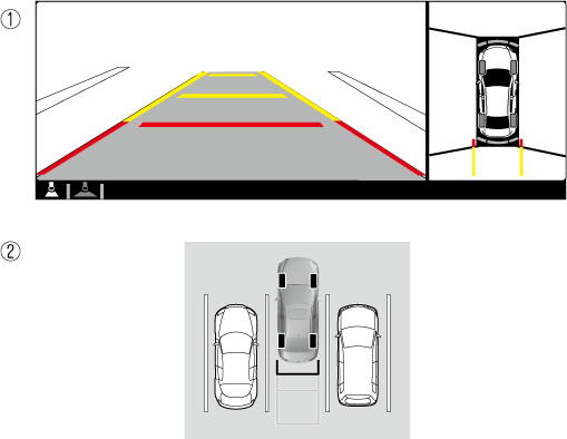 The following shows an example of vehicle parking with the steering wheel turned to the left while backing up the vehicle. When backing into a parking space from the opposite direction, the steering operation is reversed.