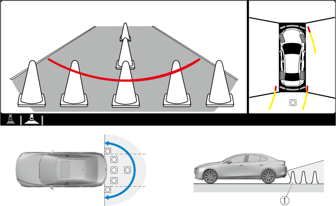 In the top view screen, the areas in black at the front and rear of the vehicle image and the seams where each of the camera images merge are blind spots.