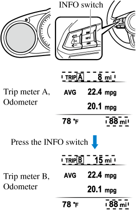 The trip meter and average fuel economy can be reset by pressing the INFO switch for 1.5 seconds or more while in each mode.
