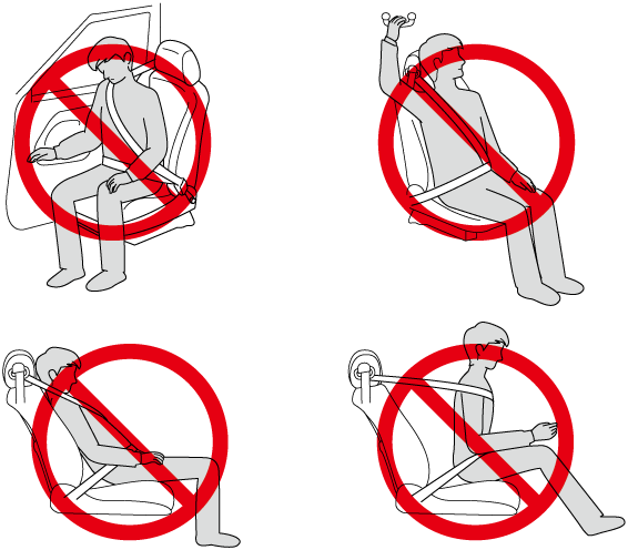 • Adjust the front seats as far back as possible and always sit upright against the seatbacks with seat belts worn properly.