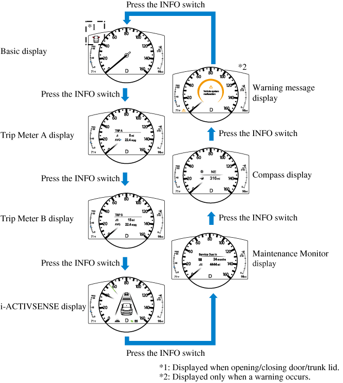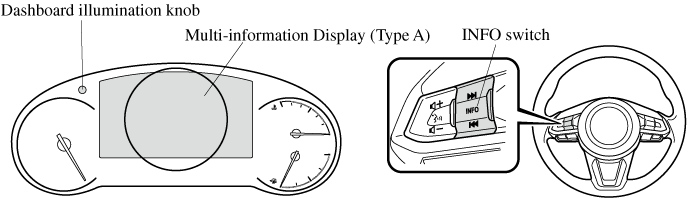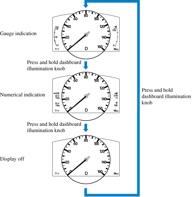 The screen content changes each time the dashboard illumination knob is pressed and held.