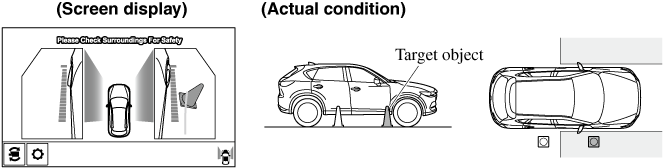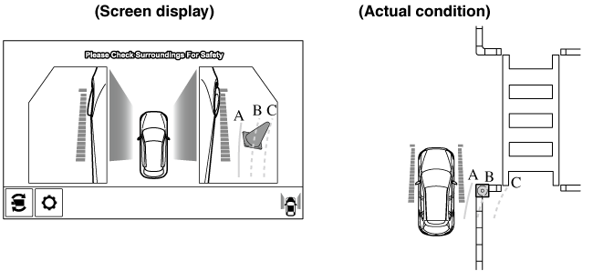 The parking sensor detection range has limitations. For example, obstructions closing in from the side and objects short in height may not be detected. Always confirm the safety around the vehicle visually when driving.