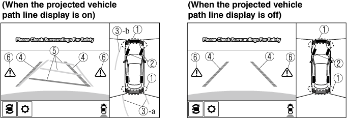 Indicates the approximate projected path of the vehicle. Moves in conjunction with the steering wheel operation. a) Indicates the path where the rear wheels are expected to travel. b) Indicates the path where the outer side of the vehicle is expected to travel. |
