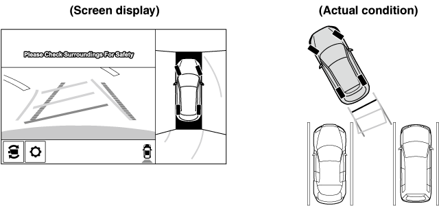 Because there might be a difference between the image displayed on the screen, such as indicated in the following, and the actual conditions when parking, always check the safety at the rear of the vehicle and the surrounding area directly with your eyes.