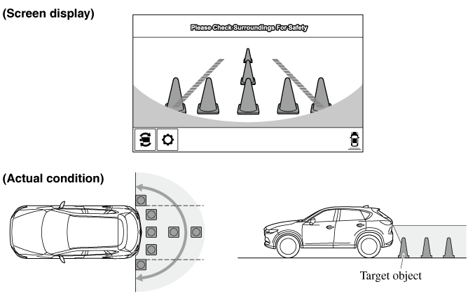 The parking sensor obstruction detection indication does not display. Switch the screen display to the top view/rear view display if the parking sensor warning sound is activated.