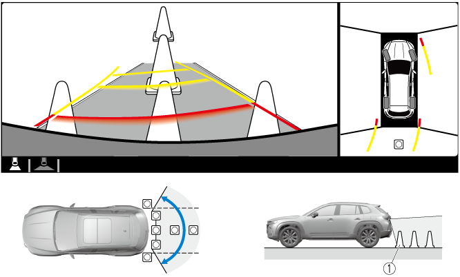 The parking sensor detection range has limitations. For example, obstructions closing in from the side and objects short in height may not be detected. Always confirm the safety around the vehicle visually when driving.