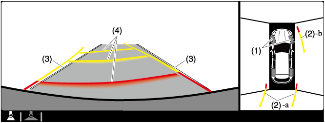 Indicates the approximate projected path of the vehicle. Moves in conjunction with the steering wheel operation. a) Indicates the path where the edge of the rear bumper is expected to travel. b) Indicates the path where the outer side of the vehicle is expected to travel. |
