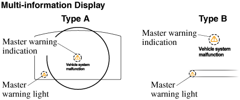 With Multi-information Display (Type A/Type B) Displays when notification of the system malfunctions is required. Check the message indicated in the display and consult an Authorized Mazda Dealer. ![]() Indication in display and master warning light in instrument cluster are illuminated at same time. This indicates a malfunction with the vehicle system. Check the message indicated in the display and consult an Authorized Mazda Dealer. For details, refer to the explanations for the warning/indicator lights, in the warning/indicator lights section, which match the symbol in the upper part of the display. If a message is not indicated in the display, operate the INFO switch to display the “Warning” screen. Refer to Message Indicated in Multi-information Display (Type A) (Search). Refer to Message Indicated in Multi-information Display (Type B) (Search). With Multi-information Display (Type C) The light illuminates continuously if any one of the following occurs. Consult an Authorized Mazda Dealer.