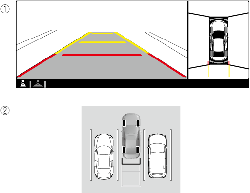 The following shows an example of vehicle parking with the steering wheel turned to the left while backing up the vehicle. When backing into a parking space from the opposite direction, the steering operation is reversed.